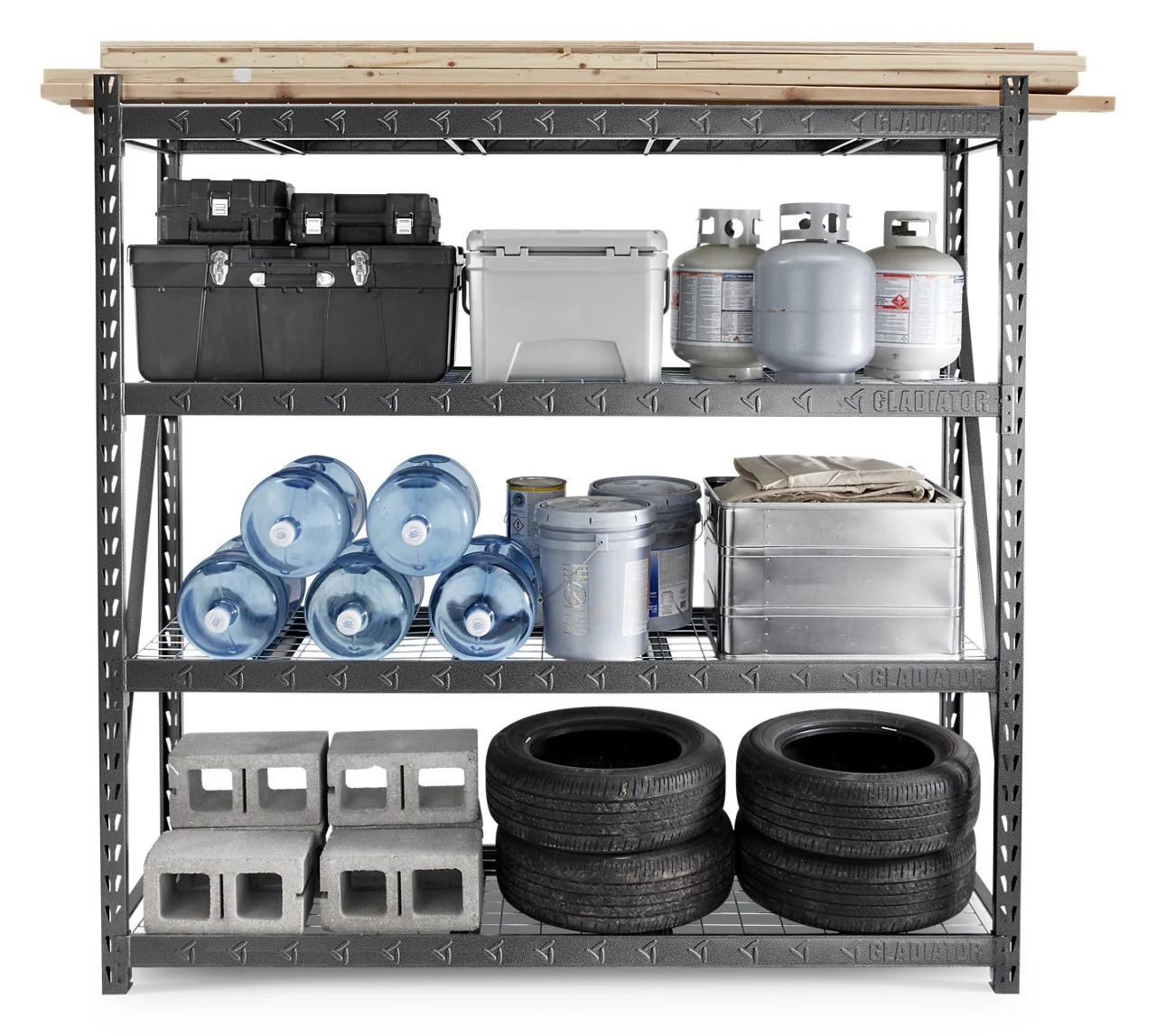 When it comes to superior strength and size, look no further than the 90" x 90" Gladiator® Heavy Duty Mega Rack. With over 50 sq ft (4.7 sq meters) of storage space and up to 8,000 lbs weight capacity, our largest freestanding rack yet can handle the heaviest tools, parts and equipment you pack on it. Plus, its four adjustable shelves can easily be arranged at various heights to fit all your bulky gear in one convenient location.